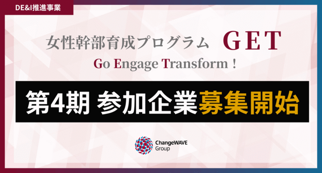組織変革・経営人材育成を行う株式会社チェンジウェーブグループ(本社:東京都港区、代表取締役社長CEO:佐々木裕子)は、女性幹部候補を対象とした実践型育成プログラム「GET(Go, Engage, Transform)」第4期の参加企業募集を開始したことをお知らせいたします。
