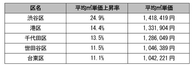 当社が調査した“最新”のワンルームマンションの平均坪単価の上昇率によると、渋谷区が前年比24.9%とトップに、港区は次点の14.4%、千代田区は13.5%でした。世田谷区は11.5%、台東区は11.1%と上位5エリアはいずれも10%以上の上昇が明らかとなりました。