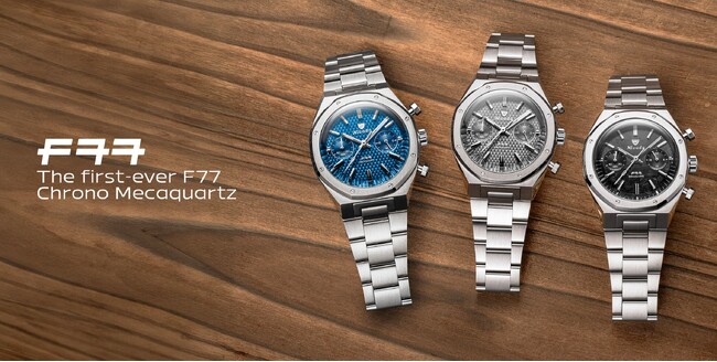 今回登場する「F77 ChronoMecaquartz」は、シリーズとしては初のメカクォーツ・クロノグラフであり、既存モデルの復刻ではなく、完全な新コレクション。F77が築いてきたデザインコードを継承しながら、よりアクティブで現代的な使い勝手を備えたタイムピースに仕上げた。F77を象徴する“ウーブン(編み込み)パターン”を採用したブルーダイヤルとグレーダイヤル、そしてテクニカルな雰囲気を持つカーボンパターンのダイヤルを備えた、合計3品番がラインナップ。ブルーは光の角度によって表情が変化し、スポーティな清涼感を演出。グレーは落ち着いたモノトーンの中にF77らしいテクスチャーの深みが際立ち、よりシックで汎用性の高い印象に仕上がっている。カーボンダイヤルは最もモダンでアグレッシブな印象で、シリーズに新たな個性をもたらしている。