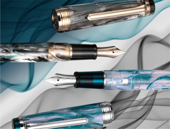 ■『VEILIO 万年筆』透明ベースの国産アクリル切削材を使用し、マーブル柄を万年筆の“顔” であるペン先を覆うベールに見立て、ベール(veil)と色(iro)を組み合わせた「VEILIO」シリーズ。