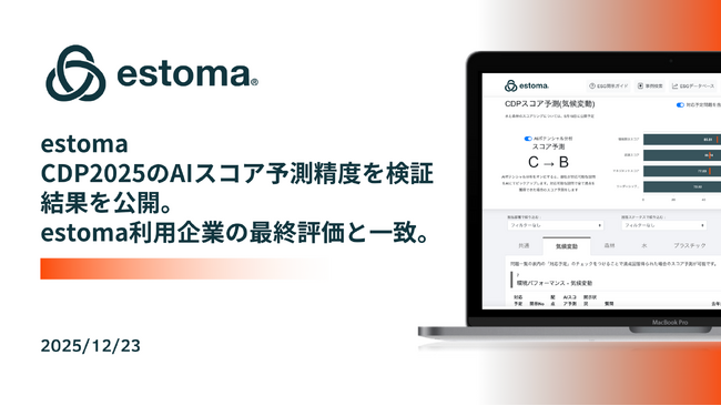 ESG情報統合管理クラウド「estoma(エストマ)」を提供する株式会社estoma(本社:東京都千代田区丸の内、代表取締役:伊藤総一郎)は、estomaのAI機能を活用して作成・支援した企業のCDP回答において、AIによるスコア予測がCDPより発表された最終評価と100%合致したことをお知らせ致します。本結果は、estomaが提供するAI回答生成、スコアシミュレーションの精度の高さを証明しました。今後もestomaは、企業のCDP対応における大幅な業務効率化と評価向上に貢献してまいります。