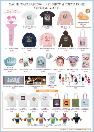 芸歴20年目という記念すべき節目に行われる東京ドーム公演にふさわしく、スペシャルなグッズが勢ぞろい。これまでの渡辺直美の軌跡を感じられる写真を使用したアイテムをはじめ、渡辺直美のPOPで唯一無二な世界観を表現するため、人気クリエイターとの限定コラボレーションが実現しました。人気クリエイターの作品を大胆に落とし込んだグッズや、普段使いしやすいカレッジテイストのアイテムなど、バラエティ豊かな数々。