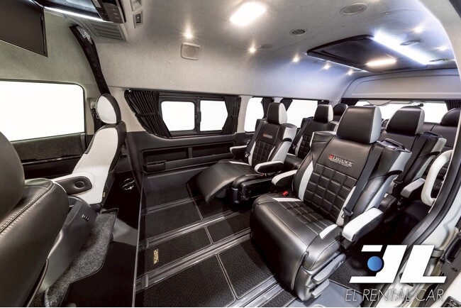 『EL RENTAL CAR(エルレンタカー)』は、ハイエースのカスタムを得意とする株式会社ジェイクラブが展開するレンタカーサービスです。ベース車両はトヨタ車体が制作しているビジネス送迎車、ハイエース「ファインテックツアラー」をカスタムしており、2~3列目のシートには、高級車などで使われているオットマン付きのキャプテンシートやダウンライトに間接照明、カウンターテーブル、電源設備なども備わっており移動時間も上質な空間で快適に過ごすことができます。また、レンタカーとしては珍しく、外装のガラスコーティングや、ホーン(クラクション) の変更、さらには電球類をLED球に交換するなど、商用車から高級車仕様への細部にまでこだわりのアレンジを加えています。