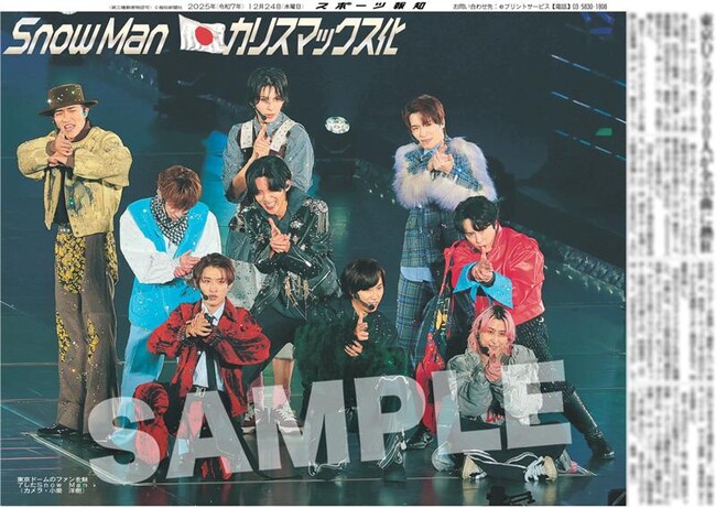 スポーツ報知を発行する報知新聞社(代表取締役社長・長谷川剛)は新聞の一部紙面をコンビニエンスストアのマルチコピー機からプリントできる「スポーツ報知コンビニプリント」サービスを展開中。スポーツ紙ならではの大きな写真を使った紙面をプリント版として販売しています。新たに12月24日付掲載、東京ドームで自身2度目の5大ドームツアー「ON」(5都市17公演、計78万人動員)の東京公演(4日連続開催)の初日を迎えたSnow Manの紙面を発売中です。全員バージョン3種類と各ソロバージョン9種類の合計12種類になります。