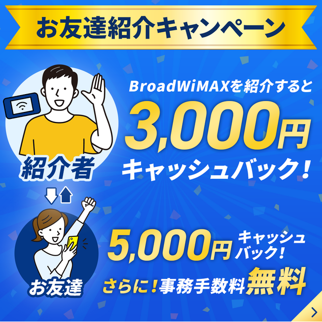 本キャンペーンにて、 Broad WiMAX を追加でお申込みまたはご家族様やご友人様にご紹介いただくと、被紹介者様には事務手数料 3,300 円(税込)が無料。さらにご利用 6ヶ月後に現金 5,000 円をキャッシュバック いたします。