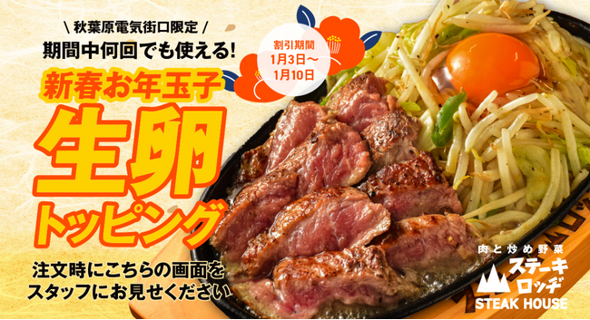 「“楽しい”でつながる世界をつくる」を理念とする飲食企業である株式会社ファイブグループの関連企業である株式会社B級グルメ研究所(本社:東京都武蔵野市、代表取締役社長:坂本 憲史)が運営するステーキハウス『肉と炒め野菜 ステーキロッヂ 秋葉原電気街口店』では、2026年1月3日(土)~10日(土)の期間、新春お年玉企画として、炒め野菜とステーキのプレート上に生卵トッピングを無料サービスいたします。バナーを提示いただくことでキャンペーン期間中、何度でもご利用いただける本サービスは、ゆで卵への変更も可能。 新年の幕開けは、美味しいステーキと野菜に卵を添えてお楽しみください!