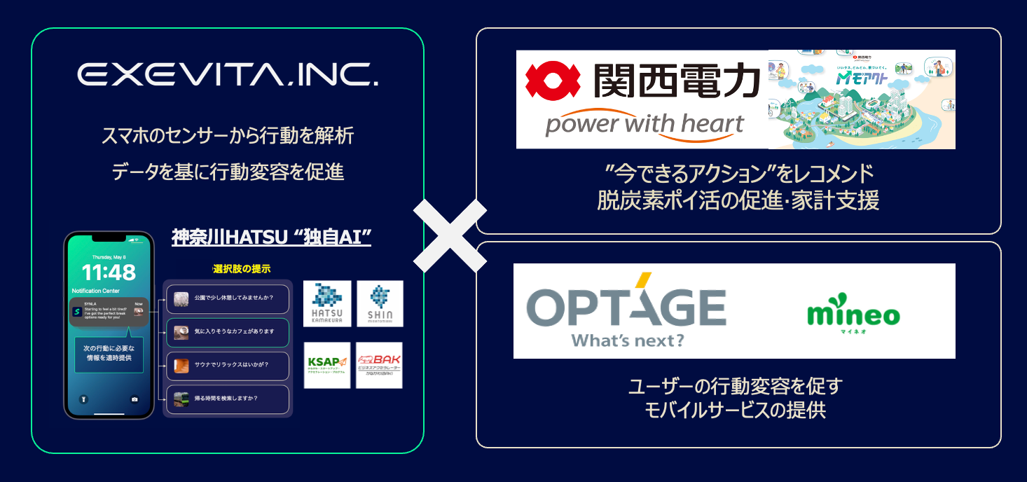 スマートフォンやウェアラブルデバイスを用いて、個人の行動を解析しデータに基づく行動変容を促す技術を持つ株式会社エグゼヴィータと、脱炭素・ソーシャルグッドアクションをミッションとして提供し行動を促すアプリ「モアクト」を提供する関西電力株式会社及び携帯電話サービス「mineo(マイネオ)」を提供する株式会社オプテージが連携し、普段の生活の中での脱炭素アクションを促すサービスを開発する。この取組により、個人が脱炭素に繋がる行動をするたびに、ポイント還元などによる仕掛などを行い、日々の行動変容を促し、生活の中に脱炭素アクションを浸透させることを目指す。