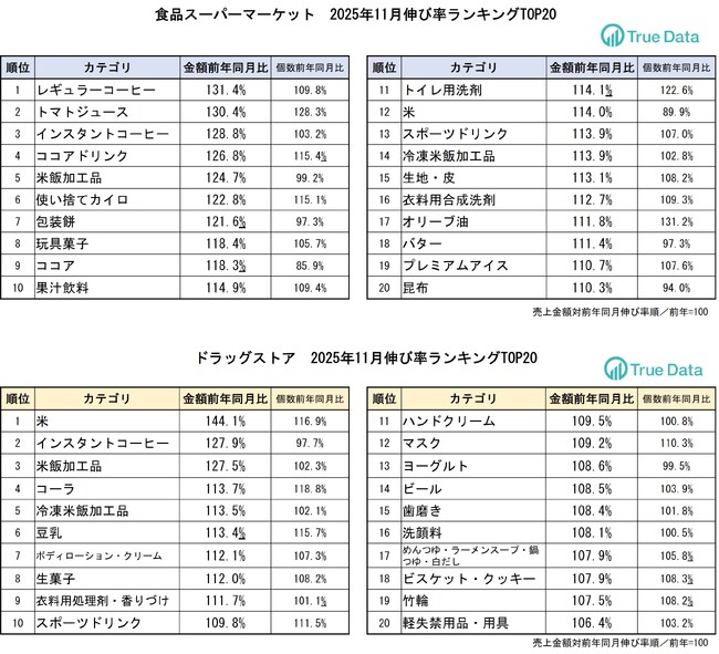 ビッグデータプラットフォームを運営する株式会社True Data(トゥルーデータ/本社:東京都港区、代表取締役社長:米倉 裕之、証券コード4416)は、当社の統計データをもとに、ドラッグストア、食品スーパーマーケットにおける2025年11月の売り上げ伸長カテゴリを発表します。