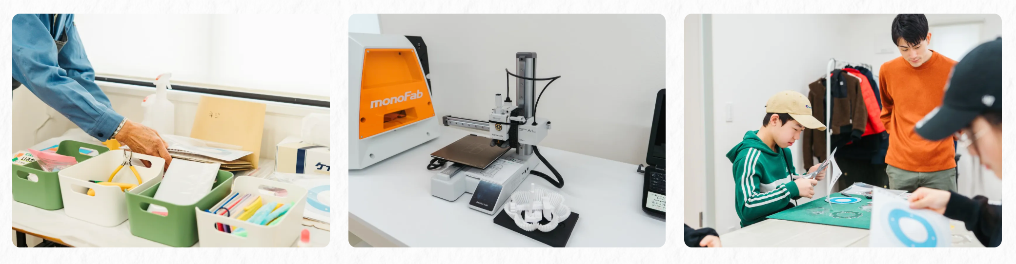 主な設備: 3D彫刻機、レーザー加工機、3Dプリンター、キッチン、展示スペース
