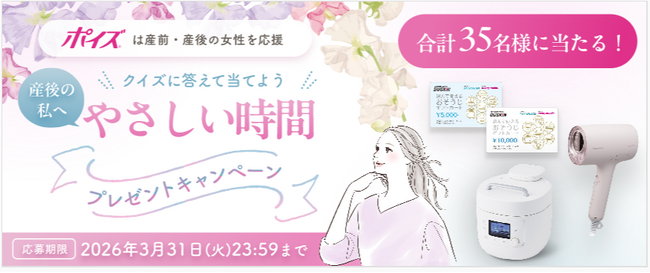 日本製紙グループの日本製紙クレシア株式会社〔住所:東京都千代田区神田駿河台4-6、代表取締役社長:安永敦美〕は、当社が医師らとともに制定した3月5日の『産後ケアの日』を記念して、クイズに答えて当てよう!『産後の私へ、やさしい時間プレゼントキャンペーン』を2026年1月1日(木)~2026年3月31日(火)23:59まで実施いたします。