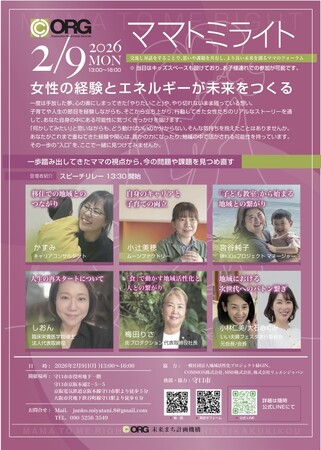 未来まち計画機構(事務局:COMMON株式会社・代表取締役 増田勇樹)は、女性の実体験を地域政策・まちづくりへとつなげる対話型フォーラム「ママトミライト ~女性の経験とエネルギーが未来をつくる~」を、2026年2月9日(月)に大阪府守口市役所にて開催いたします。