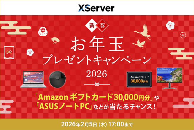 エックスサーバー株式会社(所在地:大阪市北区、代表取締役:小林 尚希)は、「Amazonギフトカード30,000円分」や「ASUS ノートPC」、「ニンテンドープリペイドカード」などの豪華賞品が抽選で当たる「新春!お年玉プレゼントキャンペーン2026」を開催します。