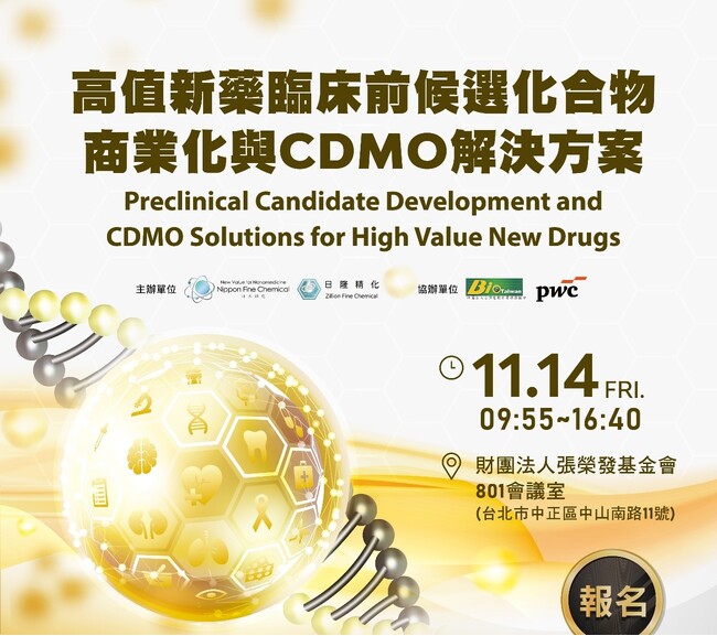 日本精化株式会社(本社:大阪市中央区、代表取締役執行役員社長:矢野 浩史)リピッド事業本部および当社のグループ会社 日隆精化國際股份有限公司(ZILLION FINE CHEMICALS INTERNATIONAL CO., LTD.)は、2025年11月14日(金)、張榮發基金会国際会議センター(台北市)にて「高付加価値な新薬前臨床候補化合物の商業化およびCDMOソリューション」をテーマにセミナーを開催しました。