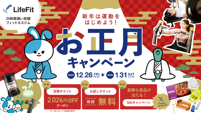 ITを活用したヘルステック事業を展開する株式会社FiT(本社:京都府京都市、代表取締役:加藤恵多、以下「FiT」)は、2025年12月26日(金)~2026年1月31日(土)の約1ヶ月間、24時間フィットネスジム「LifeFit」にて「新年は運動をはじめよう!お正月キャンペーン」を開催いたします。