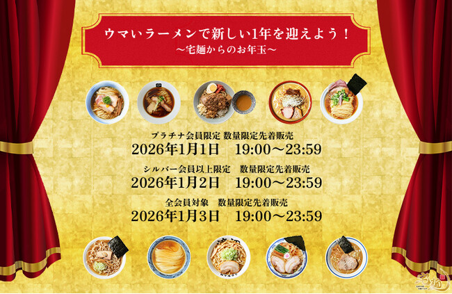 国内最大級のラーメン専門通販サイト「宅麺.com」を運営するグルメエックス株式会社(本社:東京都港区、代表取締役社長:冨澤 文秀)は、2025年12月29日(月)午後12時より、毎年恒例の「宅麺お年玉イベント」を開催します。
