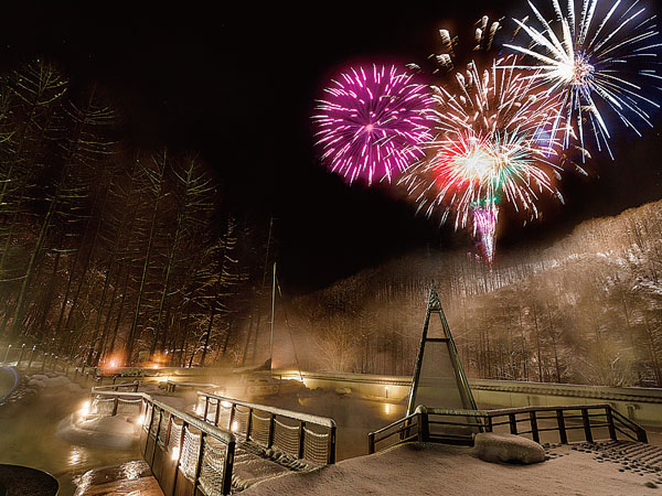 静寂に包まれた冬の北湯沢。澄み切った夜空に打ち上がる大輪の花火は、この時期だけの特別な景色です。