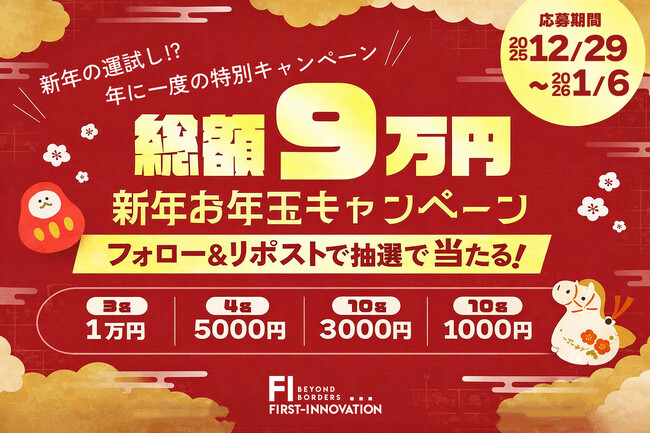 株式会社ファーストイノベーション(本社:東京都中央区、代表取締役社長:木ノ根雄志)は、2025年12月19日に創業9周年を迎えたことへの感謝を込め、同年12月29日より総額9万円分の「新年お年玉キャンペーン」をX(旧Twitter)にて実施しています。