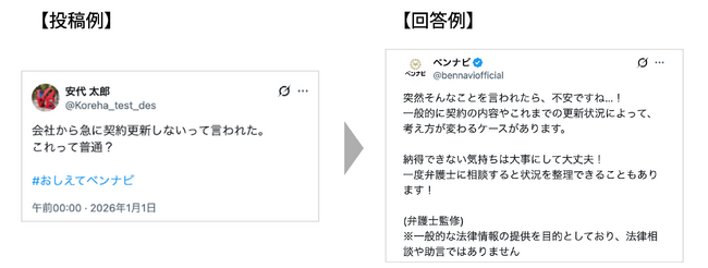 本キャンペーンは、X上でユーザーが「#おしえてベンナビ」とハッシュタグを付与して投稿した内容の中から、審査の上で選定したツイートに対して、ベンナビ公式アカウント(@bennaviofficial)が、弁護士監修のもと、一般的な法制度の考え方や知識・情報を発信するものとなります。