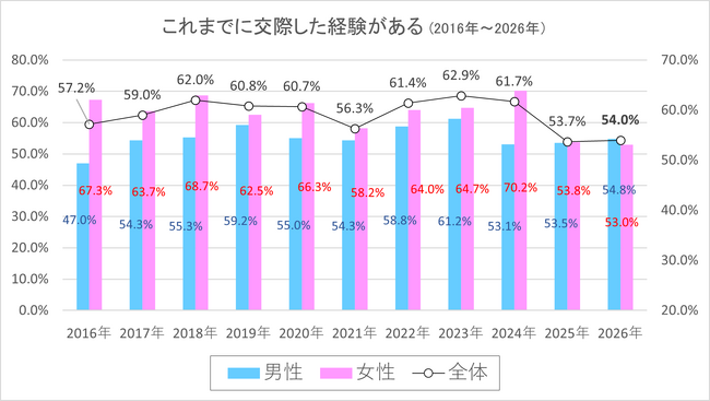・「交際経験あり」の割合は54.0%で、前年同様に過去10年の調査で最低水準で推移!
