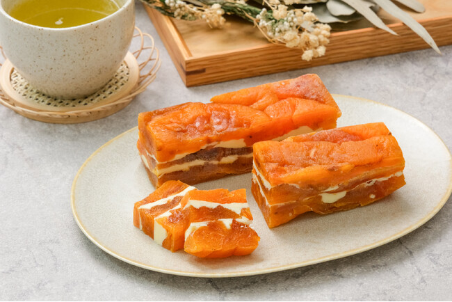 本商品は、琥珀色の柿と黄金色のバターが美しい層を成しており、どこをカットしても見事なミルフィーユ状の断面が現れます。 11cmのバータイプでお届けするため、お好みの厚さにカットして少しずつお召し上がりいただけます。お茶請けにはもちろん、ワインやシャンパンとの相性も抜群。解凍前にカットすることで、より一層断面の美しさが際立ち、ティータイムや晩酌の時間を華やかに彩ります。
