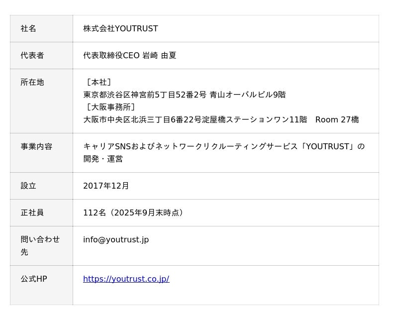 ▶ 採用支援「YOUTRUST TALENT」:https://lp.youtrust.jp/recruiter
