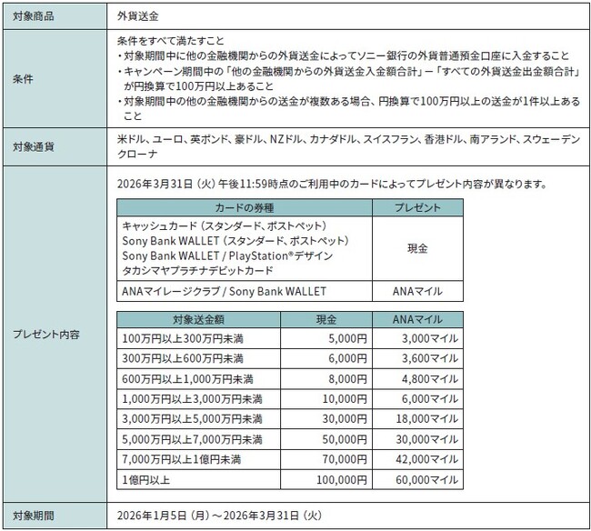 ソニー銀行株式会社(代表取締役社長:南 啓二/本社:東京都千代田区/以下 ソニー銀行)は、2026年1月5日(月)より、キャンペーンを実施しますので、お知らせします。