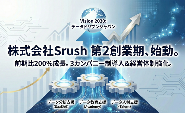 中堅・中小企業のデータ活用推進に取り組む株式会社Srush(本社:東京都品川区、代表取締役:樋口 海、以下 Srush)は、事業の急成長と人員増加に伴い、2026年1月より経営体制の刷新および本社オフィス(五反田JPビルディング内)の増床移転を行いました。 併せて、新たに策定した長期ビジョン「Srush Vision 2030」の実現に向け、事業部を3つのカンパニー制へ移行したことをお知らせいたします。