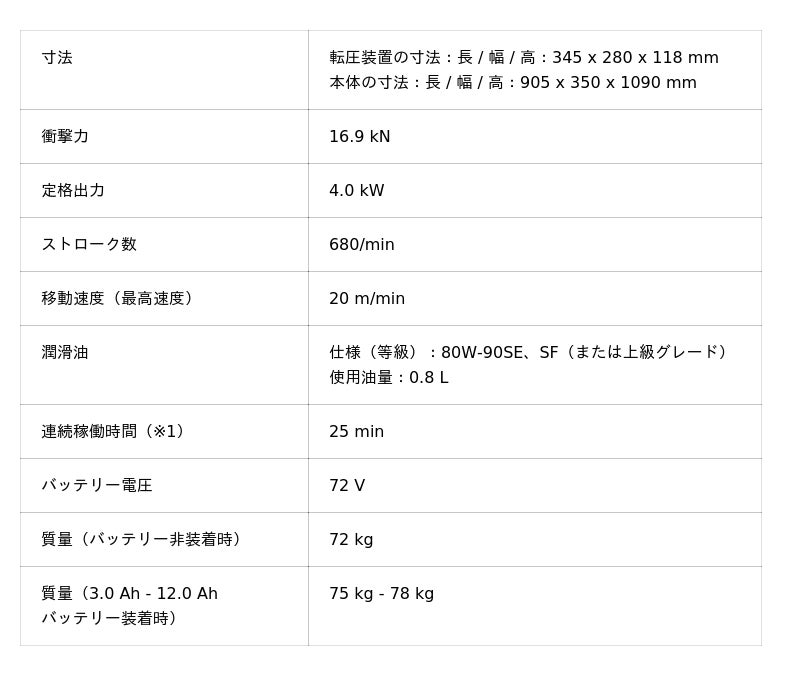 ▶25分稼働(12.0Ahバッテリー使用)、最大500mの連続転圧