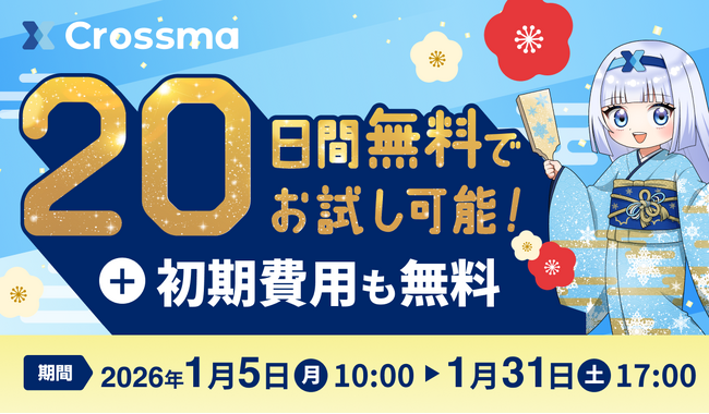 株式会社IZUMI(本社:東京都中央区京橋、代表:藤本卓治)が提供する「クロスマ」は、新規導入をご検討中の方を対象に、2025年1月5日(月)~1月31日(土)の期間限定で「新春キャンペーン」を開催いたします。