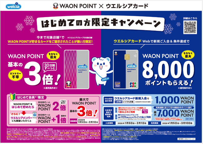 (1)【恒常特典:Web限定基本特典】Webよりウエルシアカード新規入会すると、1,000WAON POINT 進呈