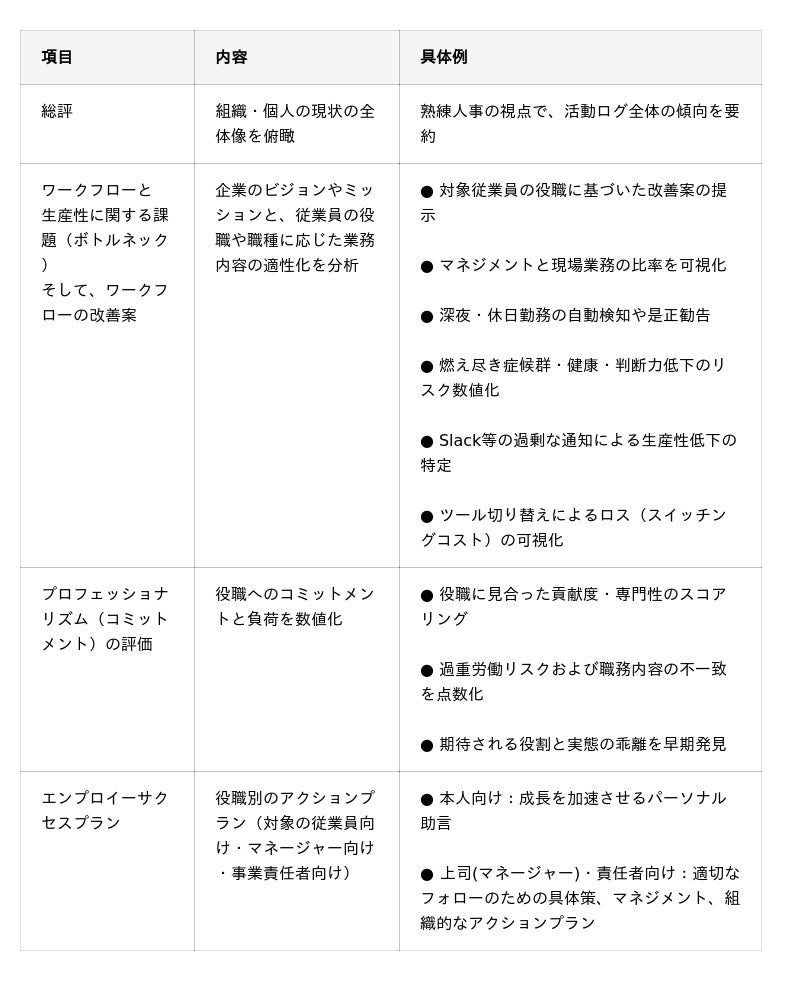 レポートは、企業のビジョンやミッションを踏まえた上で、さらに「従業員向け」「マネージャー向け」「事業責任者向け」と、それぞれの職種や視点に合わせて、最適な提案が自動で出力されます。