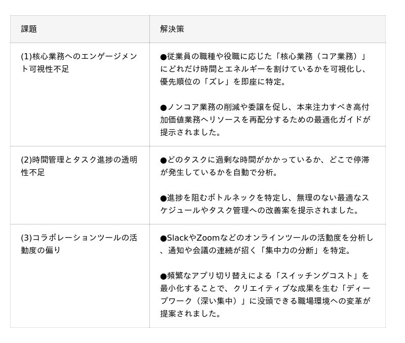 たとえば、弊社の従業員の場合、以下のような課題と改善策が提案されました。