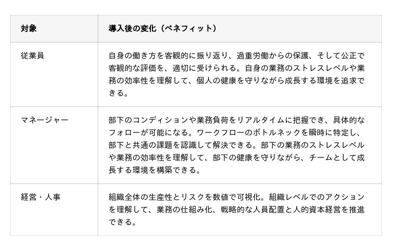 従業員一人ひとりのパフォーマンスと健康を守りながら、組織全体の成長を最大化する「AIマネージャー」として、機能拡充を続けてまいります。