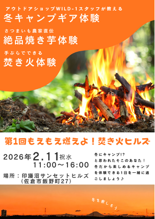 印旛沼を一望できるキャンプ場「印旛沼サンセットヒルズ」にて、冬キャンプを楽しめるイベントを開催します。手ぶらで焚き火体験や冬キャンプギアを体験できたり、サツマイモ農家による絶品焼き芋体験も楽しめます。