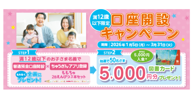 中国銀行(岡山市 頭取 加藤 貞則)では、2026年1月5日(月)より、「お子さま口座開設キャンペーン」を実施しております。