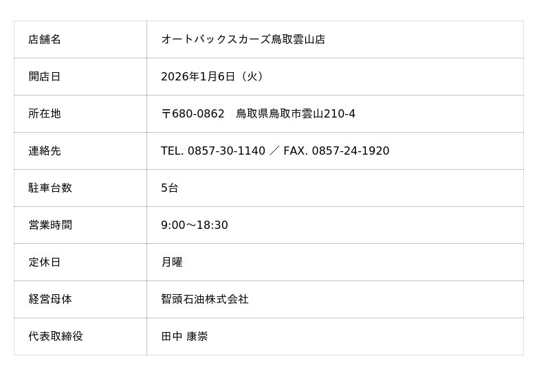 株式会社オートバックスセブン(代表取締役 社長:堀井勇吾)が展開する車買取・販売事業「AUTOBACS CARS(以下、オートバックスカーズ)」は、オートバックスカーズフランチャイズ契約を智頭石油株式会社(代表取締役:田中康崇)と締結し、2026年1月6日(火)に「オートバックスカーズ鳥取雲山店」をオープンいたします。