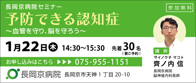 長岡京病院 1月22日(木)、認知症に関するセミナーを開催!「予防できる認知症」~血管を守り、脳を守ろう~