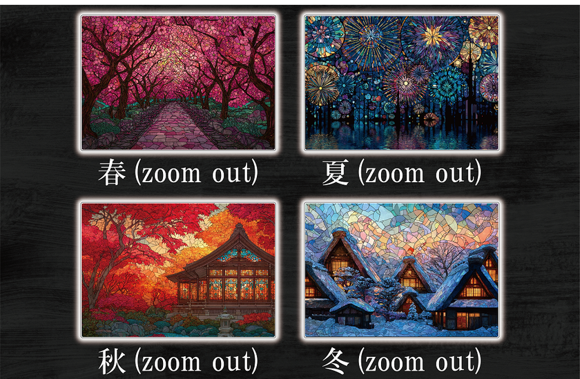 まるで本物のステンドグラスを思わせるデザイン、日本を象徴する景色や四季を表現したデザインなど全20種類を展開。AIデザインとアクリル加工技術により、ステンドグラスのような表現を、軽量かつ手に取りやすい価格で実現しています。