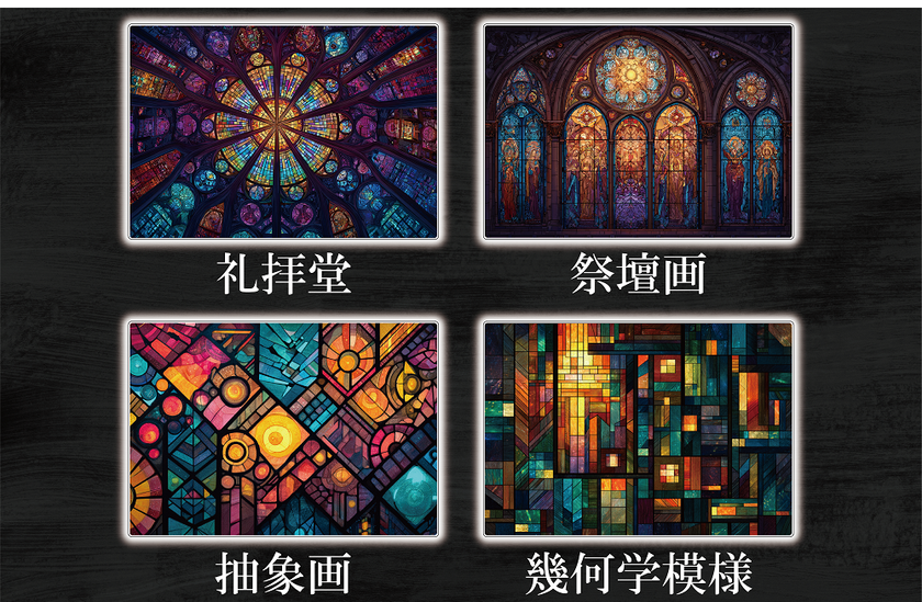 ステンドグラスの特徴的なビジュアルは活かしたまま、様々なコンセプトのデザインと組み合わせることで全く新しいアートにしました。何度も試行錯誤を重ねたAIの生成結果から、アクリルならではの光の美しさが際立つ20種を選んでおります。