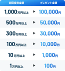 特典:投資申込金額に応じて次の金額をプレゼント。