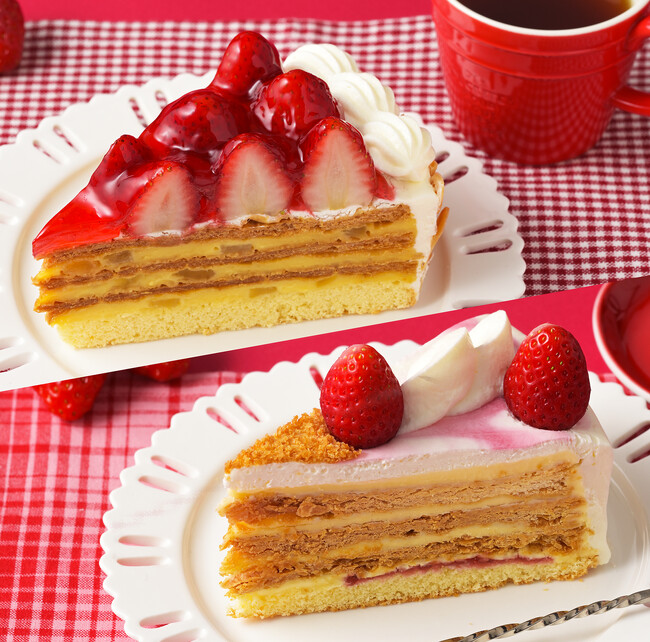また、昨年発売しご好評いただいた「苺のさくさくミルフィーユ」は、さくさく食感のパイとコクのあるバタークリーム、甘ずっぱい苺が調和した一品。パイにはホワイトチョコをコーティングし、さくさくの食感にこだわりました。