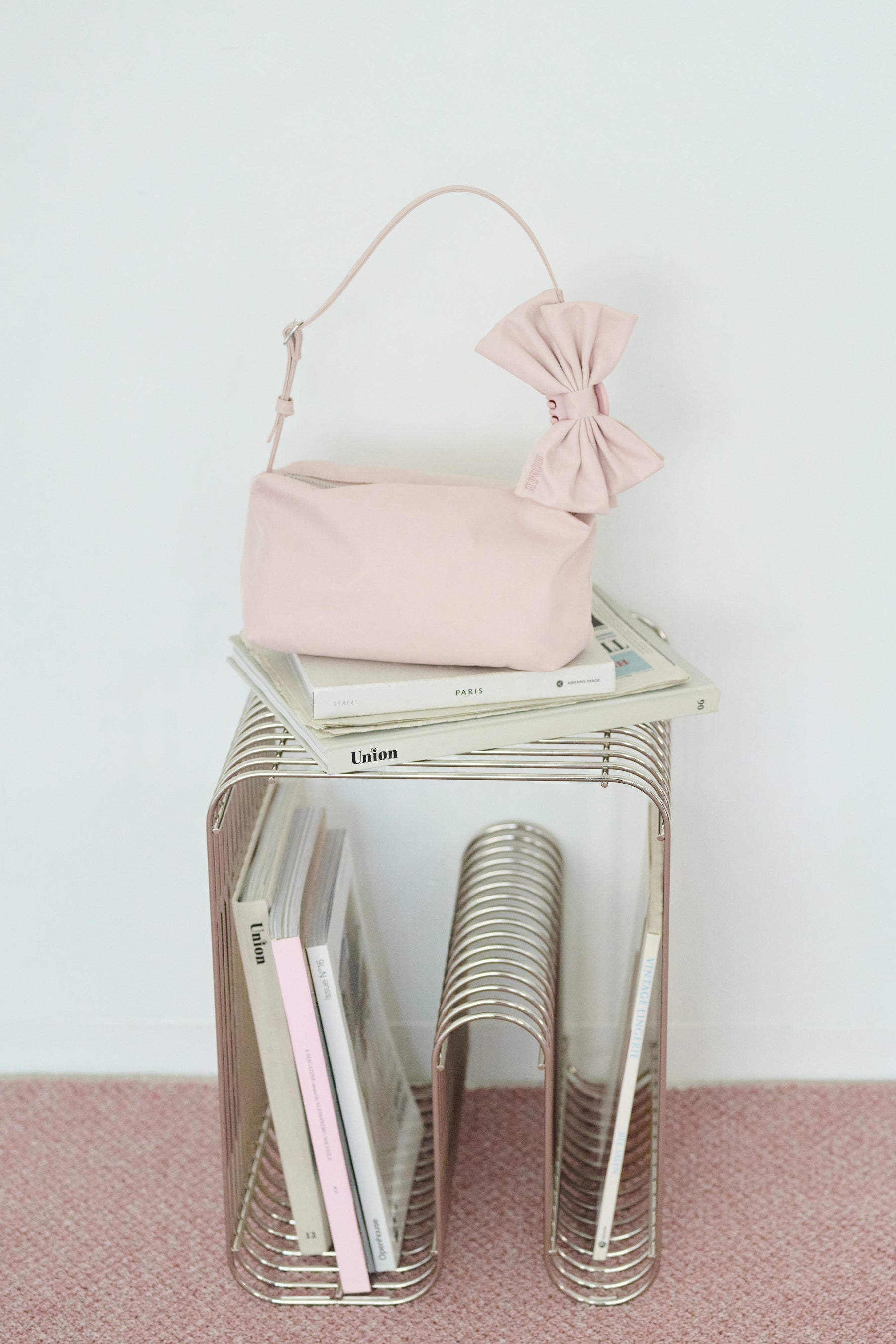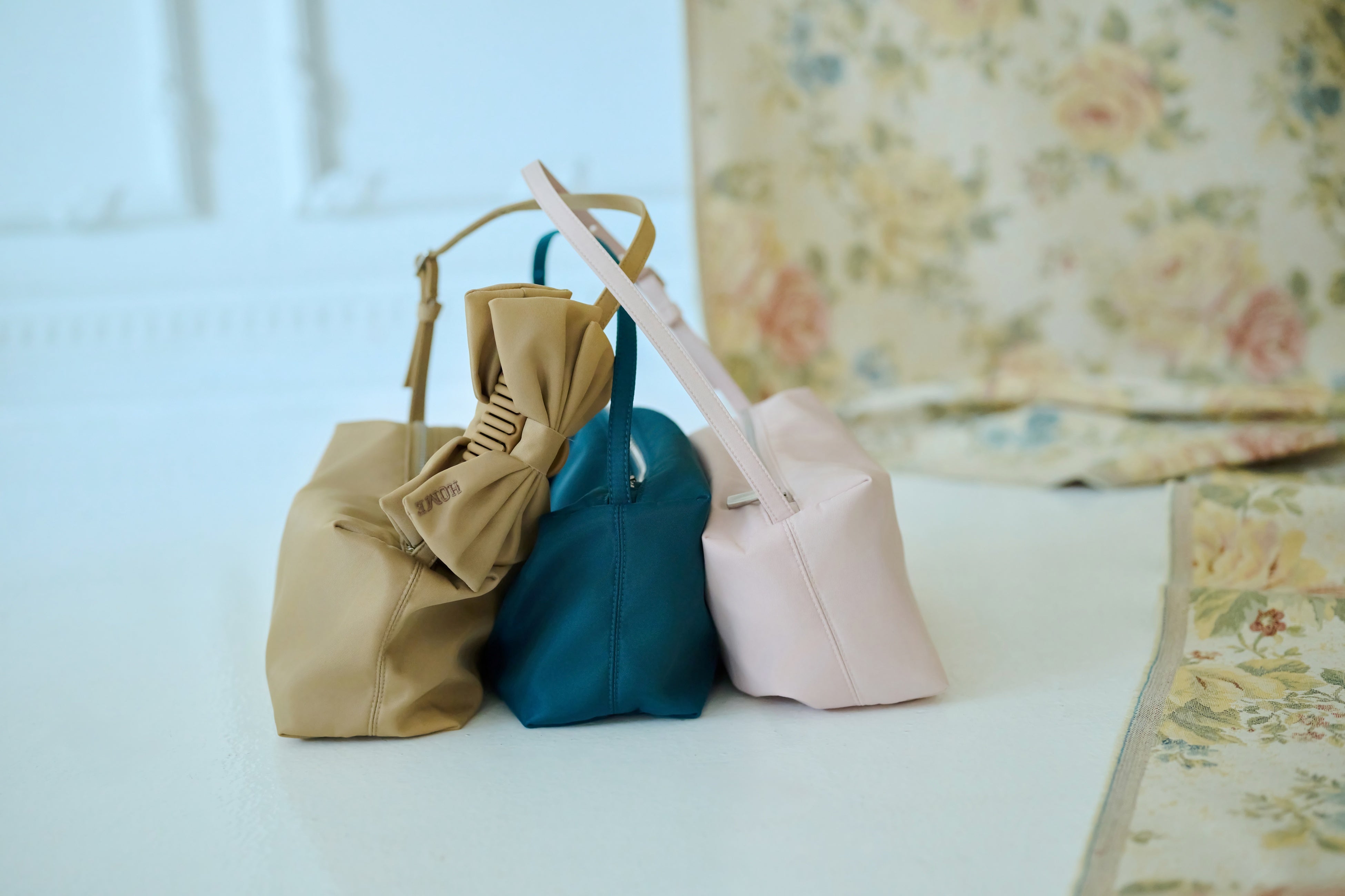 ハンドルはアジャスターで長さ調整が可能。マチ幅をしっかりとったコロンとした長方形で、500mlほどのペットボトルも入る大きさ。同シリーズのヘアバンスをバッグにつけてコーディネートもおすすめです。側面には「HOME」のロゴ刺繍を入れました。