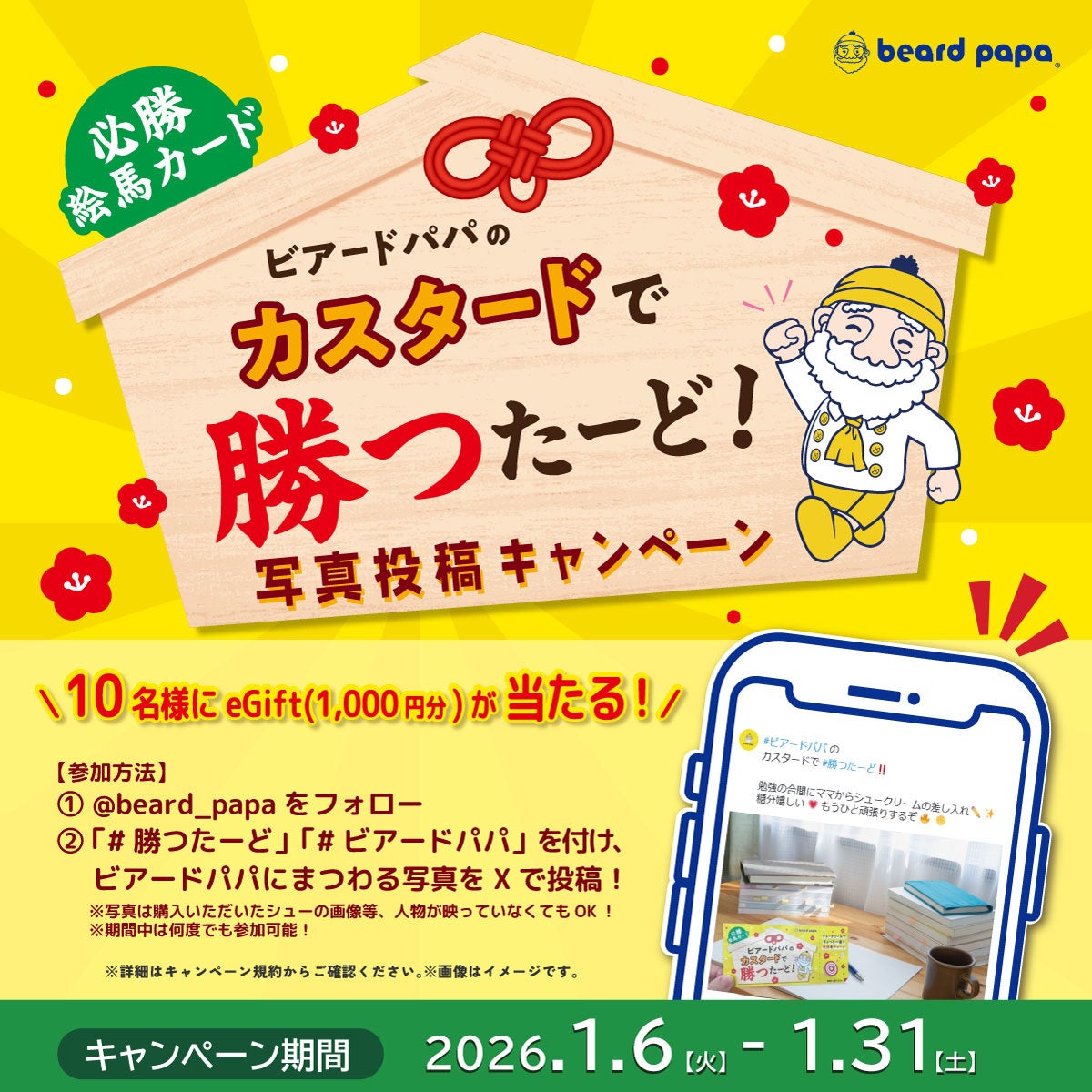 ビアードパパの公式Xアカウントをフォロー後、「#勝つたーど」、「#ビアードパパ」の両ハッシュタグを付けてビアードパパにまつわる写真を投稿ください。(シュークリームやパッケージ、必勝絵馬カードなど、人物は映っていなくてもOK)写真付きでご投稿いただいた方の中から抽選で合計10名様にビアードパパのeGiftチケット(1,000円分)をプレゼント。