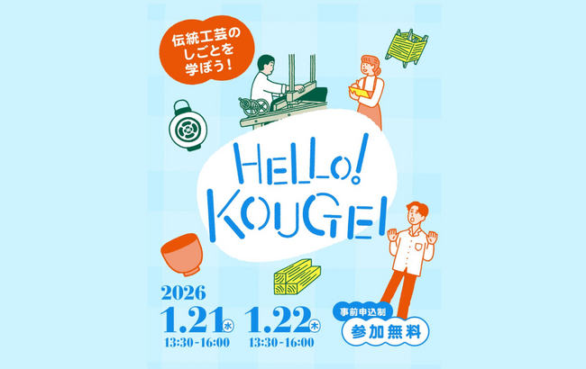 京都リサーチパーク株式会社(本社:京都市下京区、代表取締役社長:浅野貢男、以下、KRP)は、京都府、京都府雇用創造推進協議会と共催し、「しゃかいか!」の運営サポートを得て、2026年1月21日~22日に、「HELLO! KOUGEI FACTORY TOUR & WORKSHOP」を実施します。