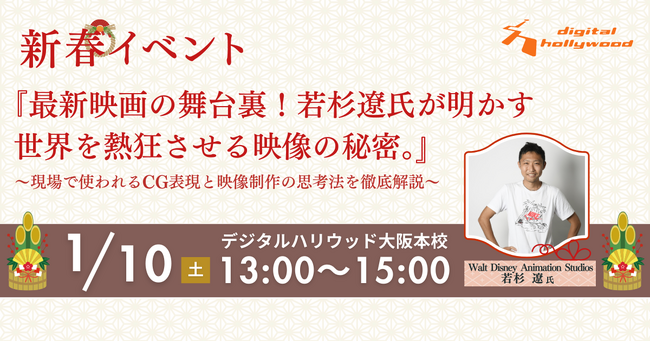 IT関連及びデジタルコンテンツの人材育成スクール[デジタルハリウッド] (運営会社:デジタルハリウッド株式会社、本社/本校:東京都千代田区、代表取締役社長兼CEO:藤井雅徳、学長:杉山知之)の大阪本校では、2026年1月10日(土)、世界的スタジオで活躍する現役CGレイアウトアーティスト・若杉遼氏を講師に迎え特別イベントを開催いたします。
