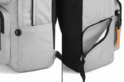 ペットボトルや折りたたみ傘をスムーズに収納できるサイドポケットを配置。開口部は左右でタイプが異なり、荷物の落下を防ぐ「ファスナー付き」タイプと、スムーズに出し入れできる「あおりポケット」タイプです。
