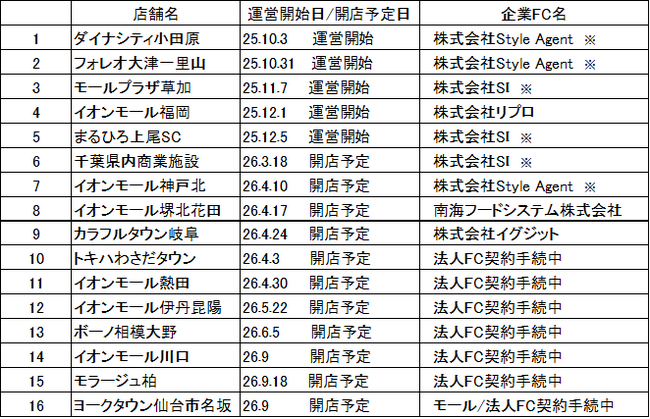 法人FCは好スタートをきりました。26年は法人FC用のモール店を11店契約済みです。出店契約済みの11店とも法人FCとFC契約済みか契約手続き中(契約書のリーガルチェック中が多い)です。これで法人FCは 10社、16店舗(うち、5店は運営中)になります。10社で全国をほぼカバーできます。なお、法人FC店舗の詳細は下記です。