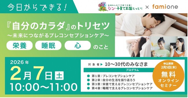 「子どもを願うすべての人によりそい 幸せな人生を歩める社会をつくる」をビジョンに掲げ、法人の従業員向け福利厚生や自治体の住民向け支援を行うヘルスケアサポートサービス「ファミワン」 https://famione.com/benefit/ などを展開する株式会社ファミワン(本社:東京都渋谷区、代表取締役:石川勇介)は、鳥取県(県知事:平井伸治)のプレコンセプションケア推進の一環として、鳥取県に在住、在勤、在学の 10代~30代の方を主な対象に、2026年2月7日(土) に「今日からできる!『自分のカラダ』のトリセツ~未来につながるプレコンセプションケア~“栄養” “睡眠” “心”のこと」をテーマにしたオンラインセミナーを開催いたします。
