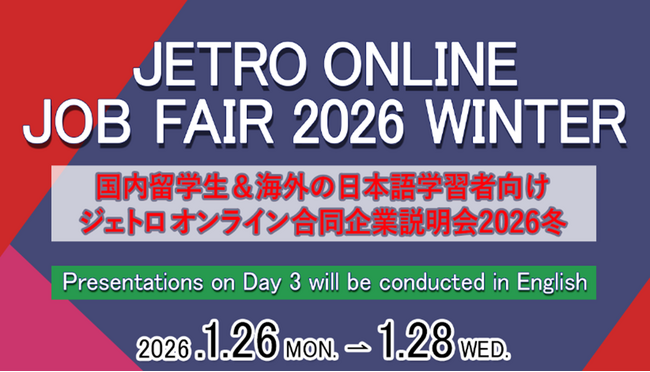 株式会社学情(本社:東京都中央区)は独立行政法人日本貿易振興機構(ジェトロ)より委託を受け、2026年1月26日(月曜)から28日(水曜)までの3日間、外国人留学生や海外の日本語学習者を主たる対象に「ジェトロ オンライン合同企業説明会 2026冬」を開催します。本イベントは、海外ビジネスの拡大やイノベーション創出を目指す日本企業と優秀な外国人材の出会いの機会を提供するもので、外国人留学生向けとしては日本最大級のジョブフェアです。