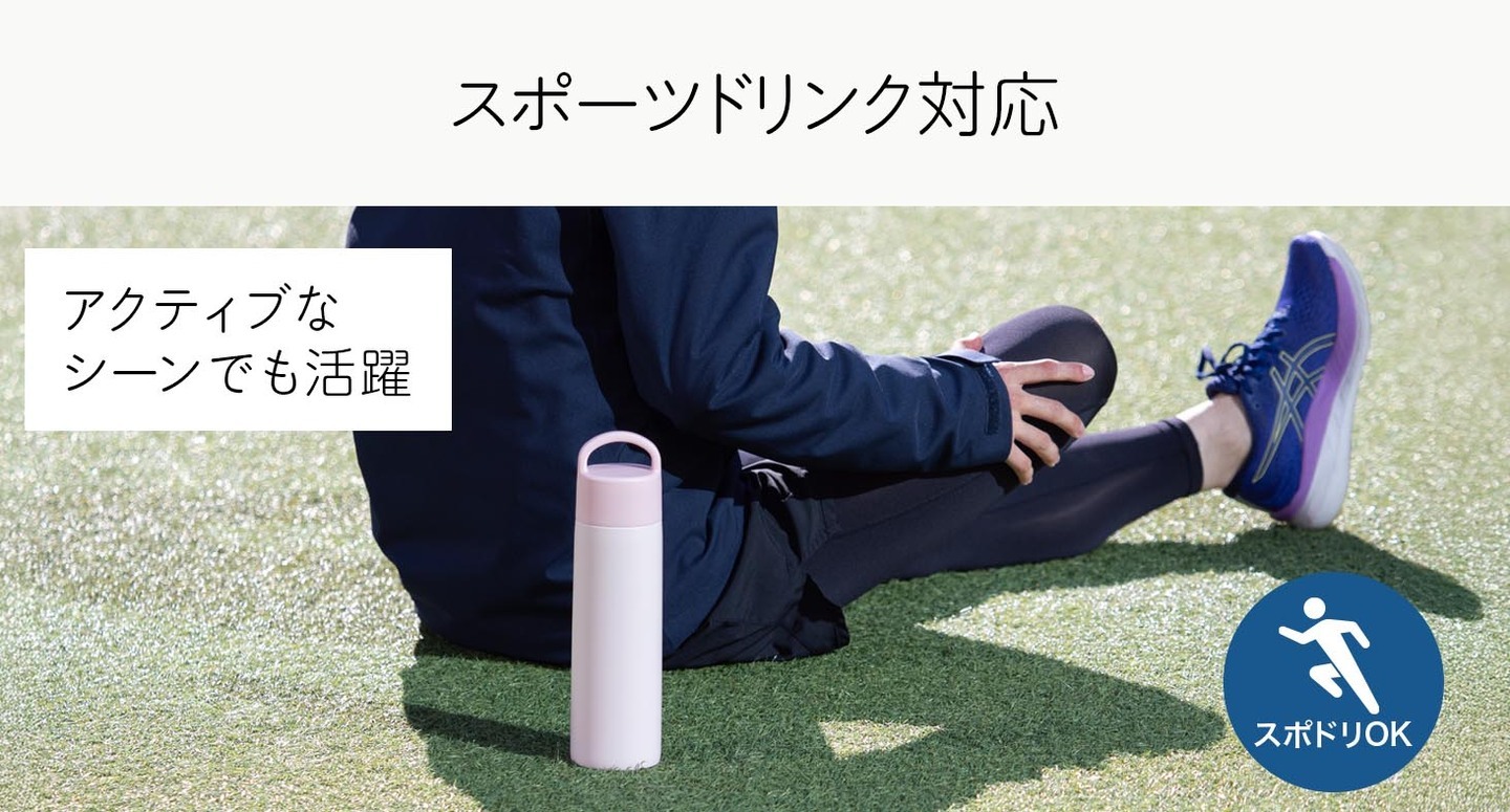サビにくいステンレス素材でスポーツドリンクにも対応しています。日常の水分補給はもちろん、ジムでのワークアウトやアウトドアなど、アクティブな場面でも活躍します。